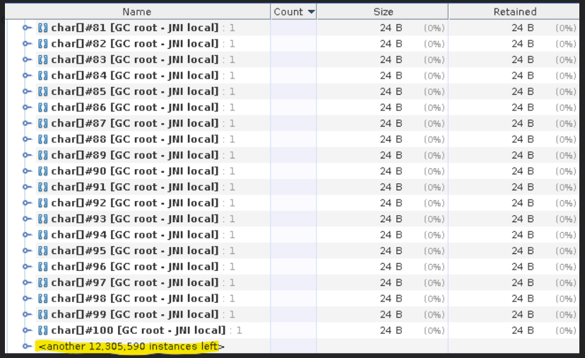 We are experiencing an OutOfMemoryError in a long-running JavaFX application. Analysis of the heap dump shows that the JavaFX Application Thread is responsible, with tens of millions of char[] objects being retained as GC roots accounting for 73.8% of the heap. These arrays are either empty or have a length of 1, typically containing the values '0' or '1'. While we are not yet certain what is triggering these char[] allocations, the fact that they appear as GC roots strongly suggests that they are being referenced from native memory, indicating that a native structure is allocating or holding these objects without proper cleanup. Over several days of runtime, these accumulated references eventually exhaust the heap.