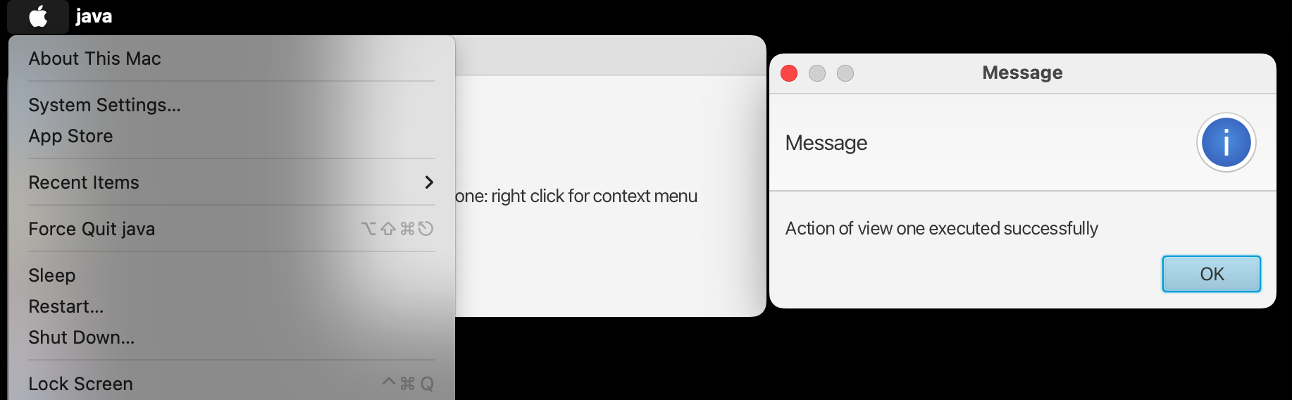 new Alert(Alert.AlertType.INFORMATION, "Action of view one executed successfully").show();