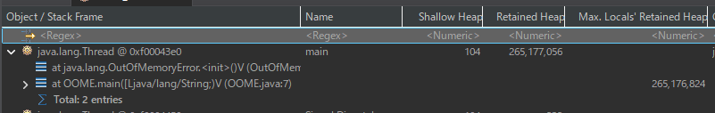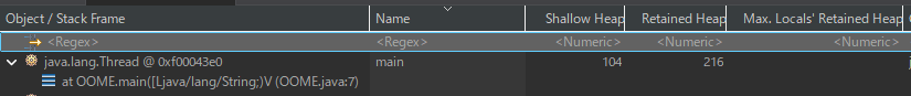 heapdumponoutofmemoryerror.png shows "thread overview" from the heapdump by `-XX:+HeapDumpOnOutOfMemoryError`. It reports `OOME.main` has large retained heap.