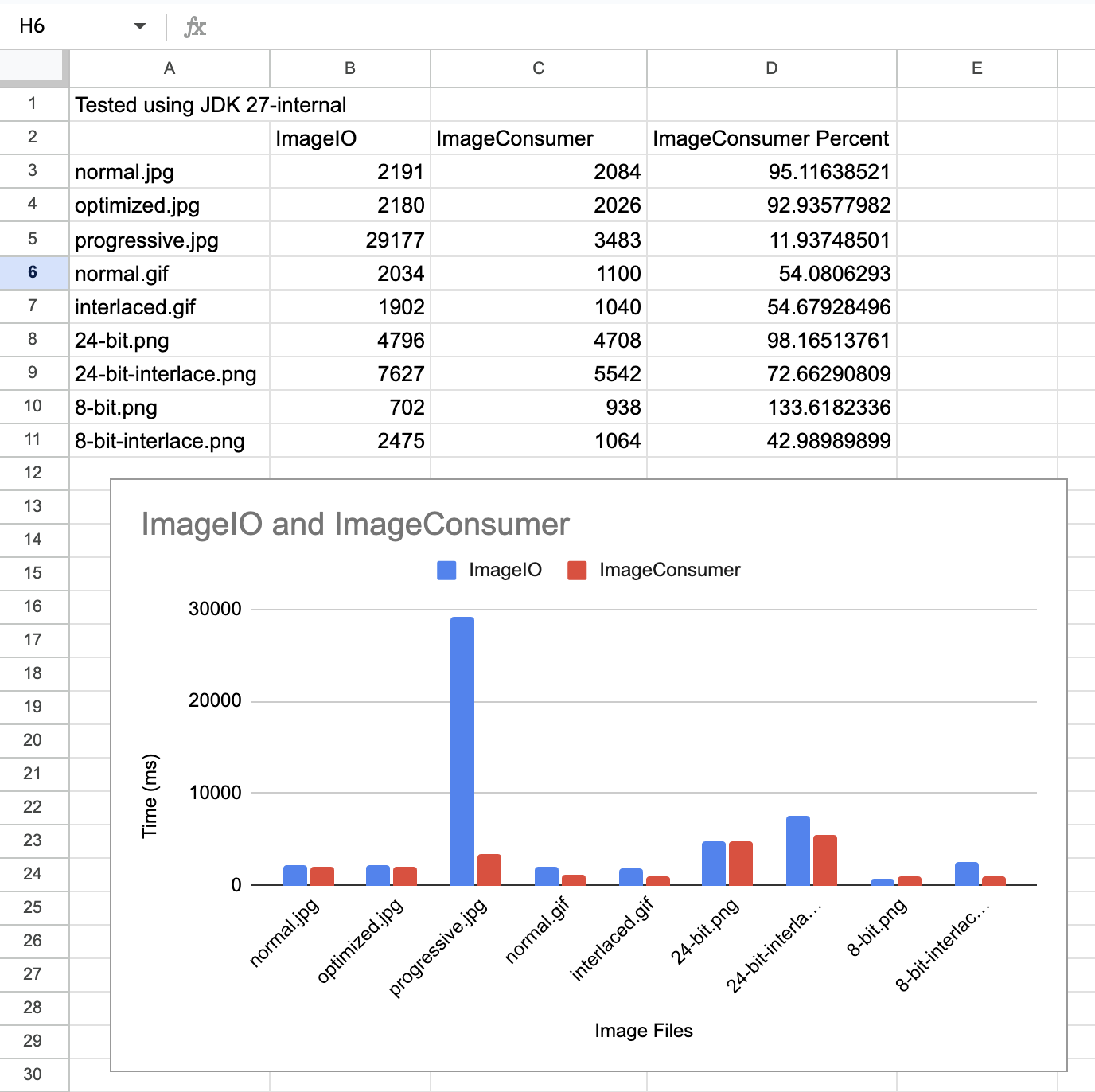 Here the "ImageConsumer" approach uses the older ImageProducer/ImageConsumer classes to create a BufferedImage in less than 20% of the time ImageIO requires.