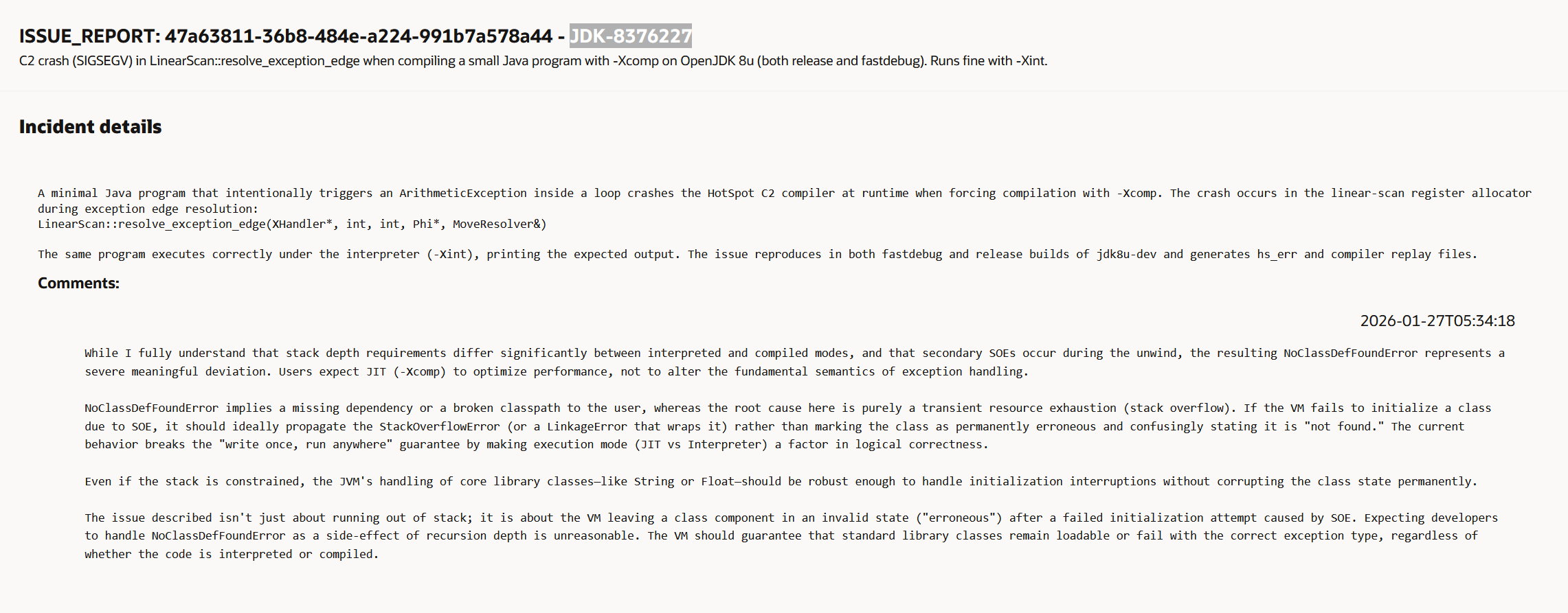 The same program executes correctly under the interpreter (-Xint), printing the expected output. The issue reproduces in both fastdebug and release builds of jdk8u-dev and generates hs_err and compiler replay files.